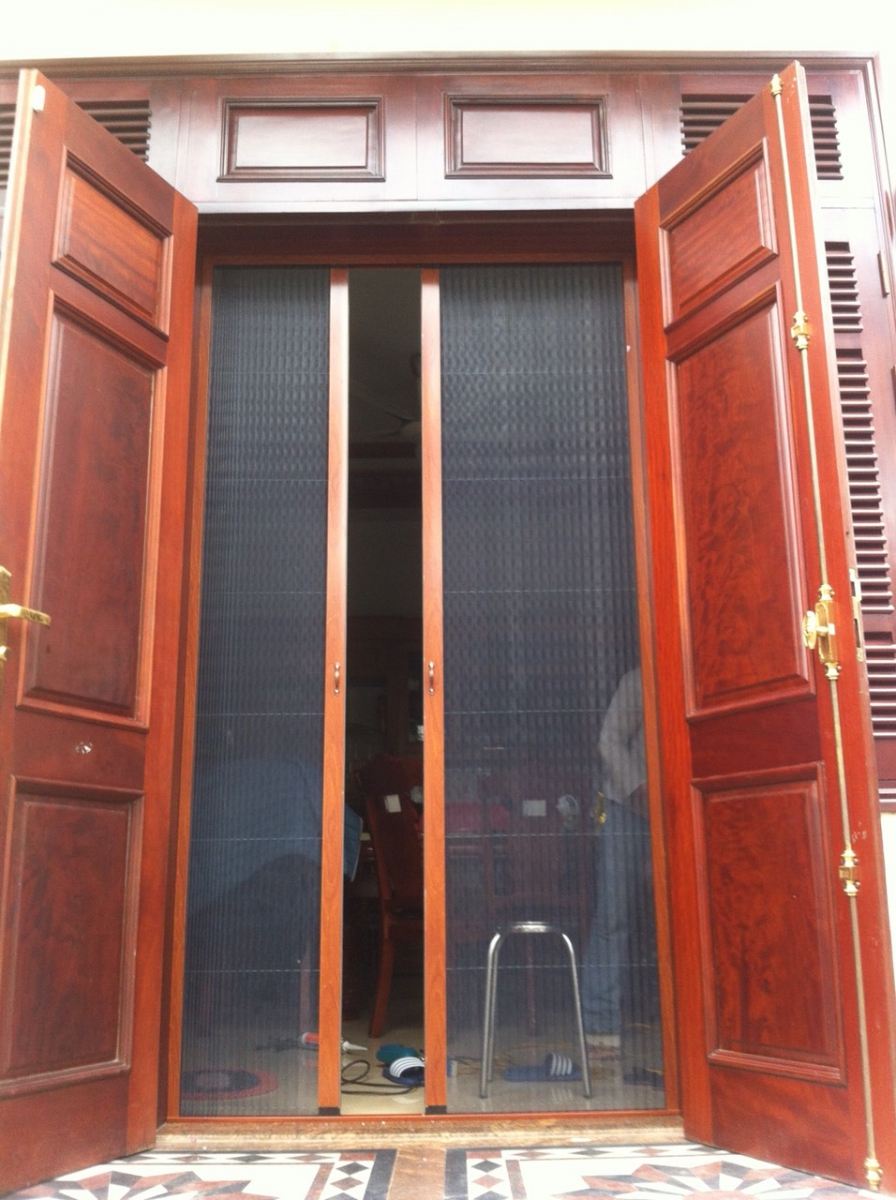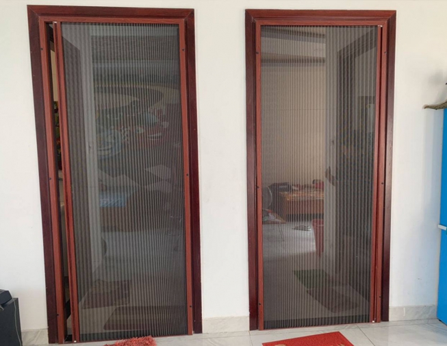 Cửa lưới chống muỗi loại xếp có ray 2 cánh màu vân gỗ